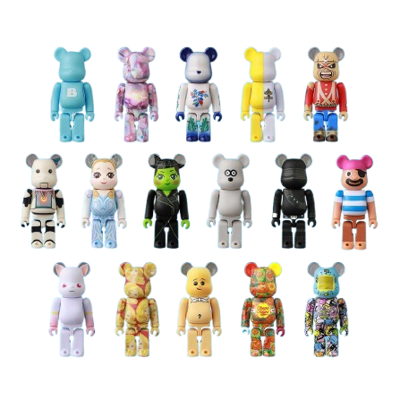 Además de los “básicos”, que son figuras unicolores en las que se encuentra una de las letras de Bearbrick (nueve figuras colocadas una al lado de la otra forman la marca), los modelos originales son creados por artistas y diseñadores contemporáneos, que colaboran con Medicom Toy.