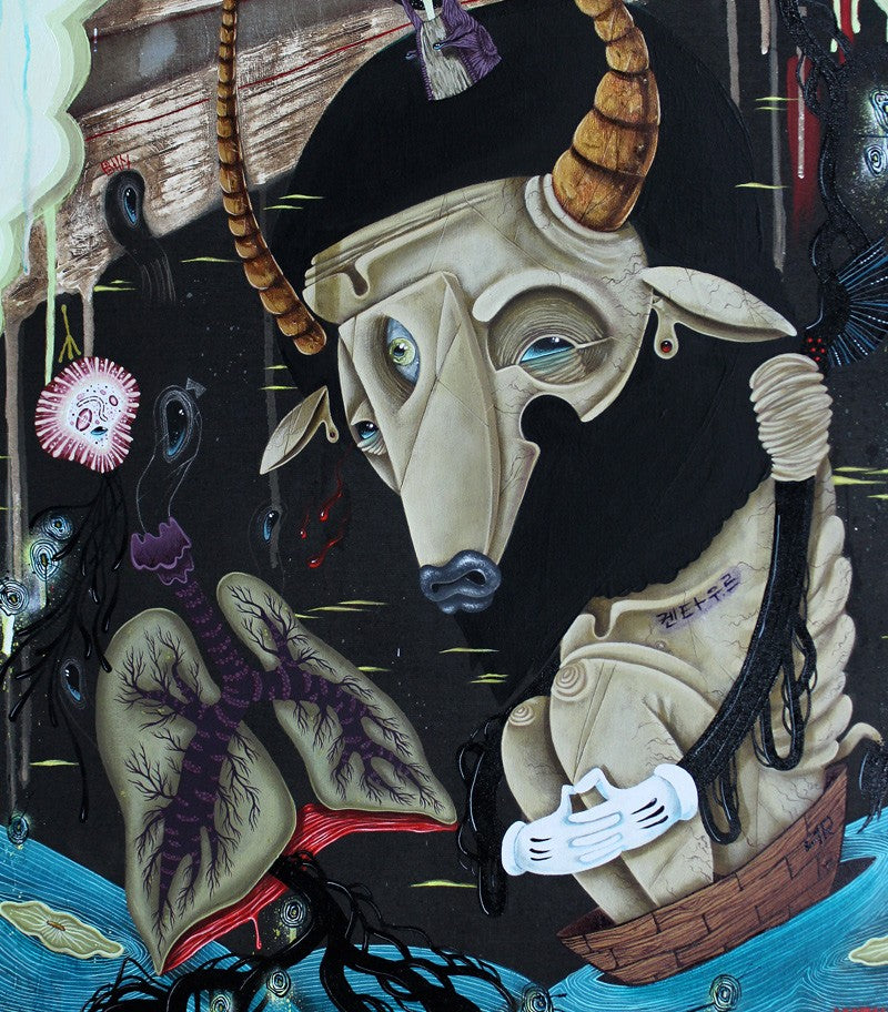 A mitad de camino entre inocencia y horror, Nicolas Giraud, también conocido como 100taur, está trabajando para explorar los conceptos de diferencia e imperfección, creando un universo poblado por criaturas fantásticas, híbridos de humanos y animales, distorsionados, poéticos, donde cada detalle es un tributo a la frase famosa Por el pintor Francisco de Goya "El sueño de la razón genera monstruos".